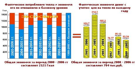 Наиболее масштабной является проблема реконструкции систем потребления, в связи с большим количеством потребителей. В связи с этим проблема комплексного решения на максимально возможном современном уровне имеет первостепенное значение. Необходимо отметить, что современные инженерные системы здания имеют тенденцию заметного усложнения. Причём усложнение идёт высокими темпами, как минимум по двум причинам. Во первых в связи все усложняющейся его функциональностью. Во вторых в связи со всё возрастающими требованиями к параметрам среды обитания. По этим причинам так называемый "экстенсивный" вариант развития инженерных коммуникаций подошел практически к своему пределу. Дальнейшее их усложнение приводит к неоправданному увеличению цены, а также к снижению надёжности, безотказности, усложнению и удорожанию обслуживания, увеличению влияния так называемого "человеческого фактора" и т.д. Кроме того в теплоэнергетических инженерных системах требуется разрешить комплекс проблем, увязывающих воедино решения специфических проблем гидравлики и теплотехники с проблемами автоматики и управления технологическими процессами. Современная микропроцессорная техника предоставляет в этом смысле большие возможности. Другим аспектом проблемы является оптимизация теплопотребления и разработка технологий автоматизации теплопотребления и связанной с этим возможности реализации задачи энергосбережения. В связи с этим всё более широкое распространение получают пункты автоматического регулирования в ИТП на основе так называемых активных узлов смешения. Современные средства автоматики вносят свой вклад в успешную работу таких узлов. В этой связи особый интерес вызывает практика применения подобных технологий. Технико - технологический аспект подобного оборудования является в каком то смысле внутренней технологической проблемой. Но экономический аспект внедрения таких систем является общественно - значимым фактором. На рис. 1 приведены экономические показатели за 6 лет эксплуатации реконструированного объекта теплопотребления. Объект представляет административное здание с проектной тепловой нагрузкой около 0,4 Гкал/час по отоплению. Однако сейчас, в связи с созреванием общественных предпосылок в повестку дня ставится решение задачи оснащения подобными системами управления объектов ЖКХ. В реализации этой задачи наряду с перечисленными проблемами возникают дополнительные специфические проблемы. К ним можно отнести: